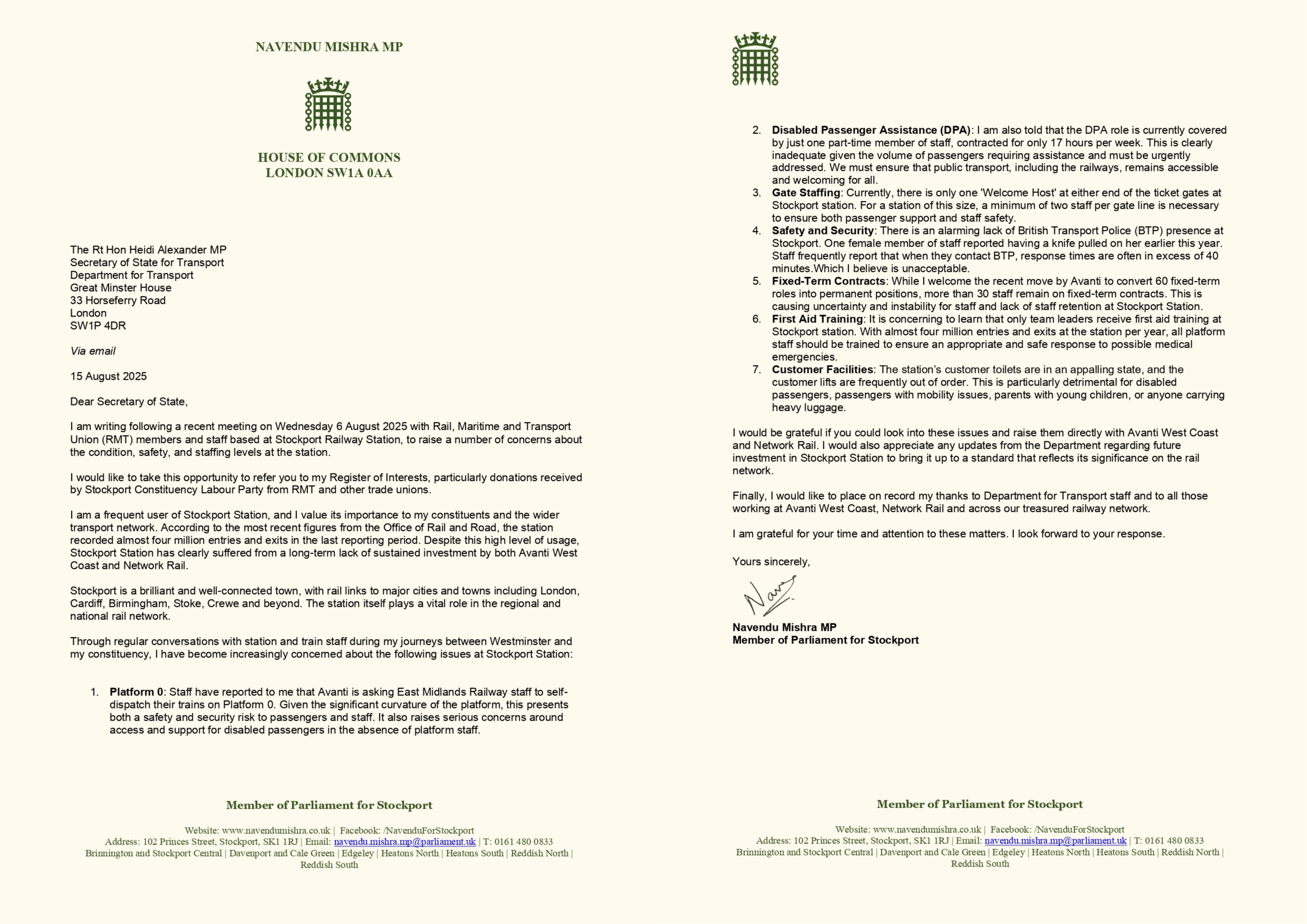 Following the meeting, I wrote to the Secretary of State for Transport to raise a number of concerns about the condition, safety, and staffing levels at the station.