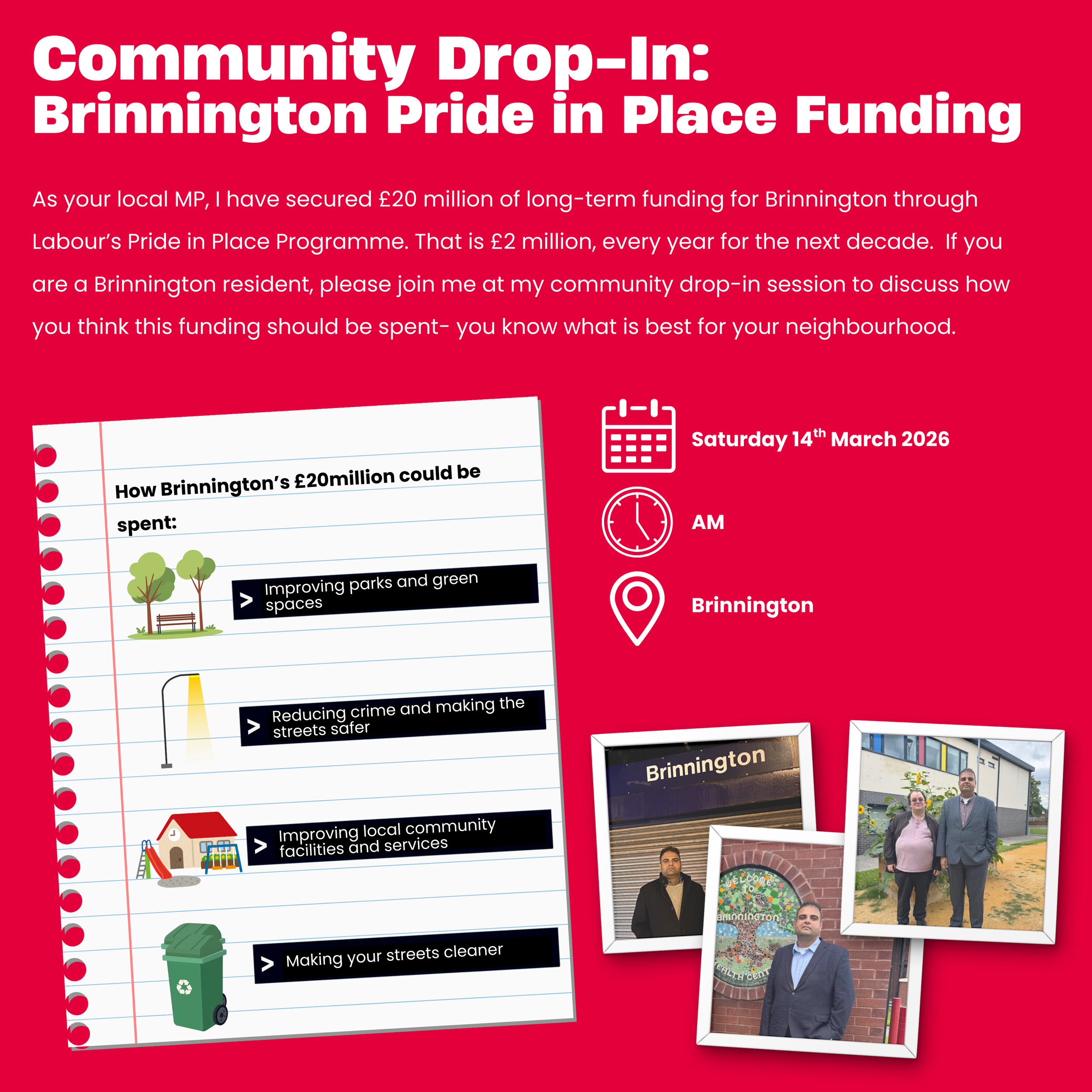 As your local MP, I have secured £20 million of long-term funding for Brinnington through Labour’s Pride in Place Programme. If you are a Brinnington resident, please join me at my community meeting to discuss how you think this funding should be spent- you know what is best for your neighbourhood.